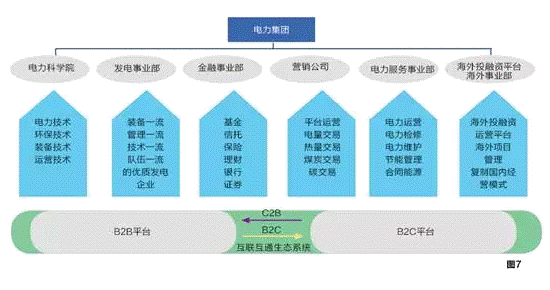 以發(fā)電業(yè)務(wù)為基礎(chǔ),以金融業(yè)務(wù)為核心,以電力營(yíng)銷(xiāo)為龍頭,以電力科研和電力服務(wù)為支撐,構(gòu)建全球化互聯(lián)互通生態(tài)系統(tǒng)。(見(jiàn)圖7)